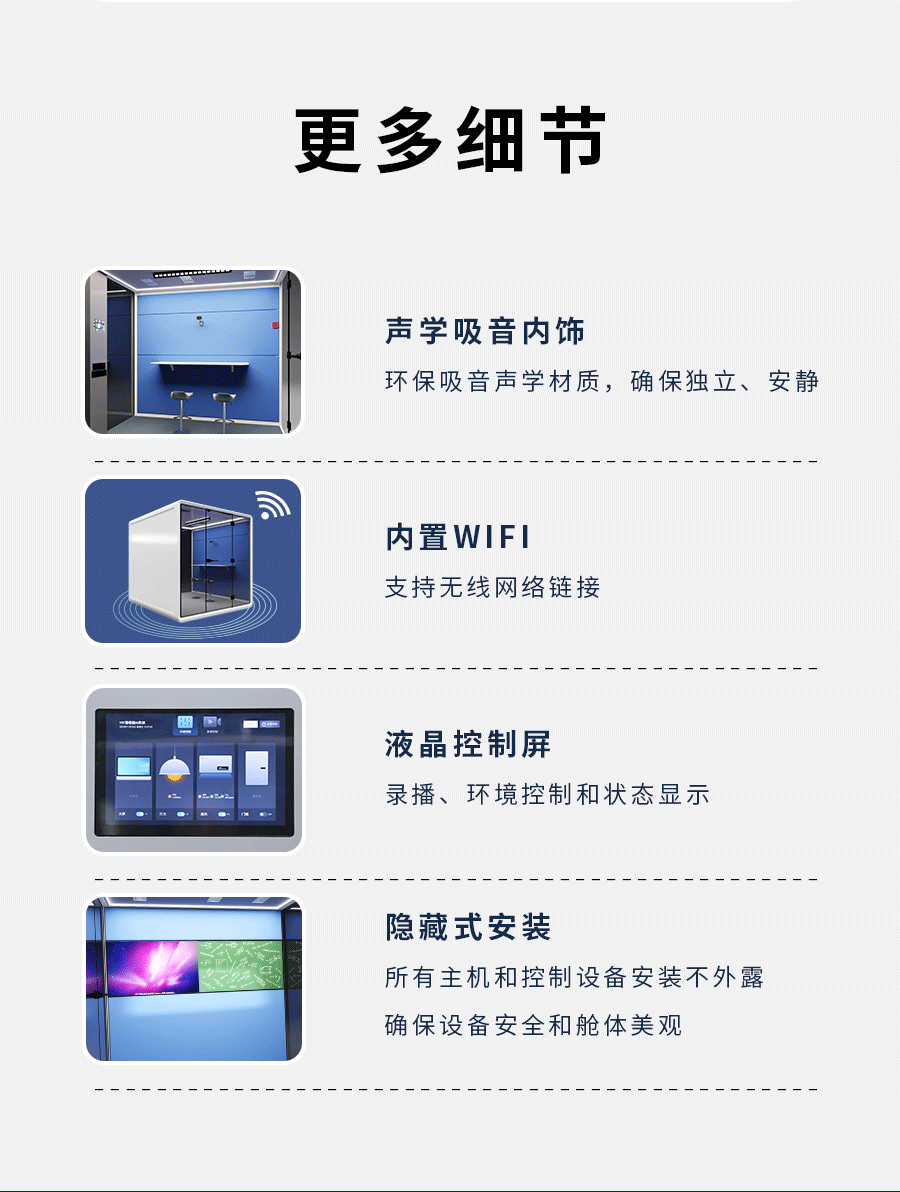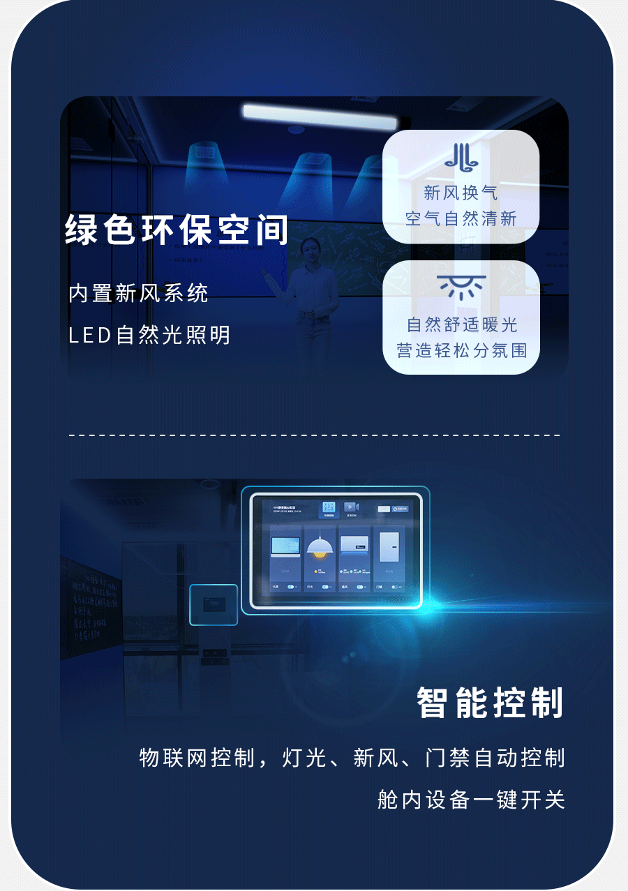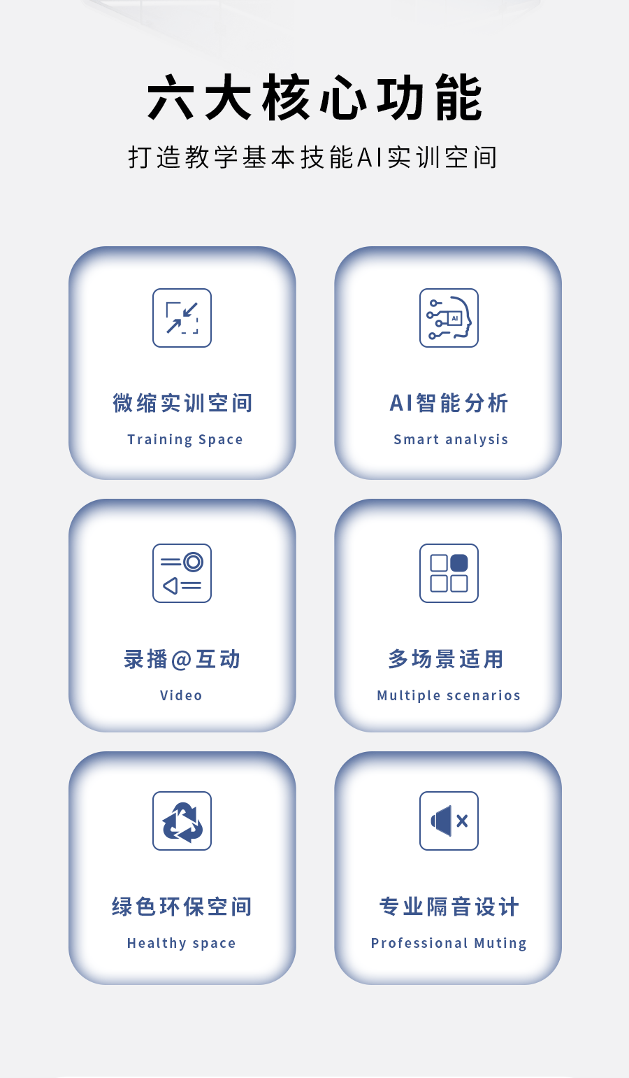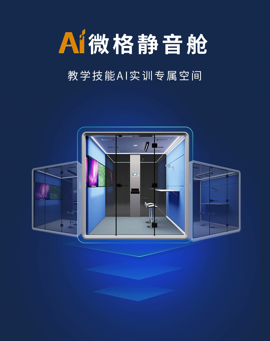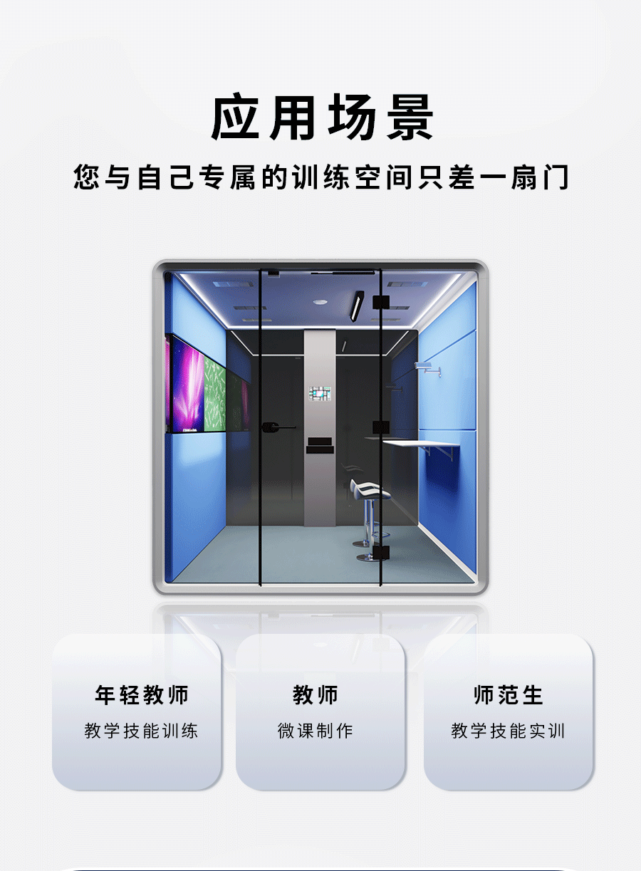服务于校园内年轻教师和师范生教学基本技能训练、微课录制等需求,将标准“AI智能实训微格教室”的智能设备与授 课 环 境,浓缩在一个精致温馨的舱体内。结合手机和系统平台高效完成教学和训练任务,通过人工智能数据分析,对训练者教学技能提升提供科学的指导和帮助。